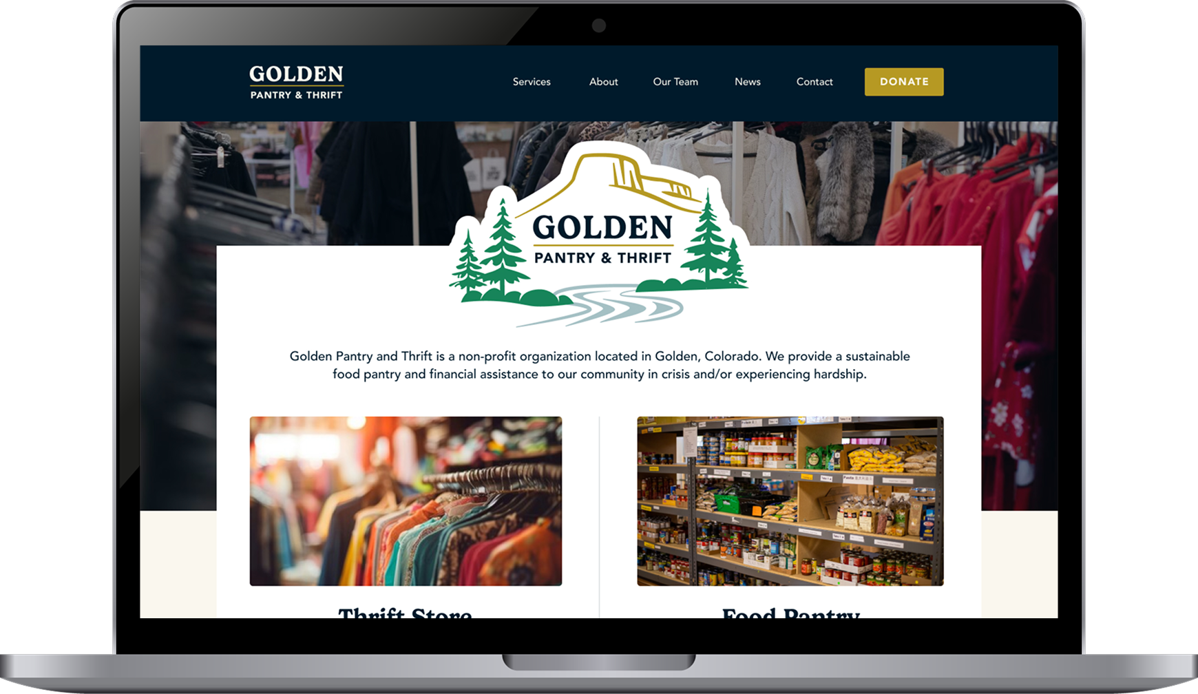 Golden Pantry & Thrift believes in the power of community and provides affordable, quality thrift finds, donated gently-used items & access to food and financial assistance to the Golden, CO community. When I first met with their director, they were going through a name and brand change, something they had been wanting to do for a long time. I worked closely with her on creating a new brand that reflects their community-centered values, as well as a nod to being in Colorado.