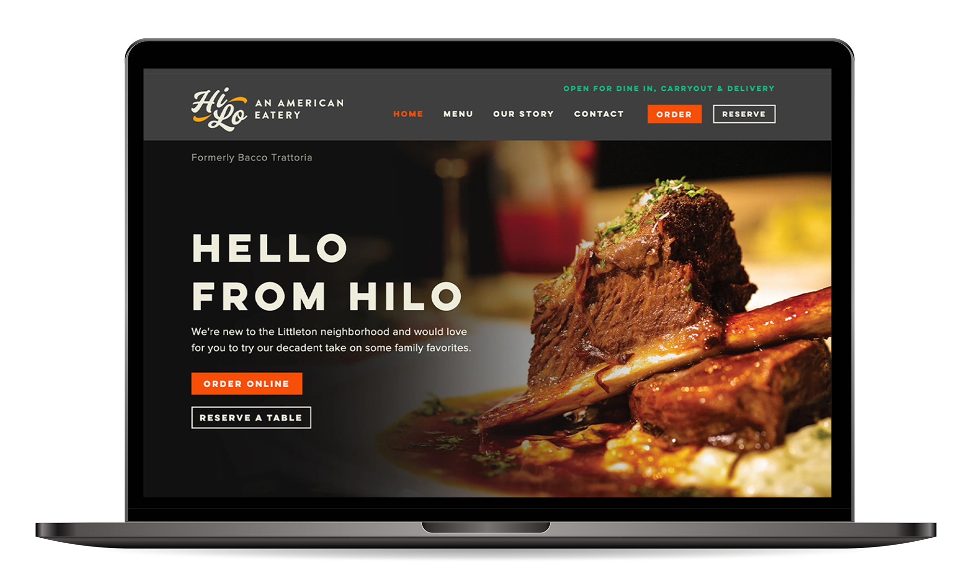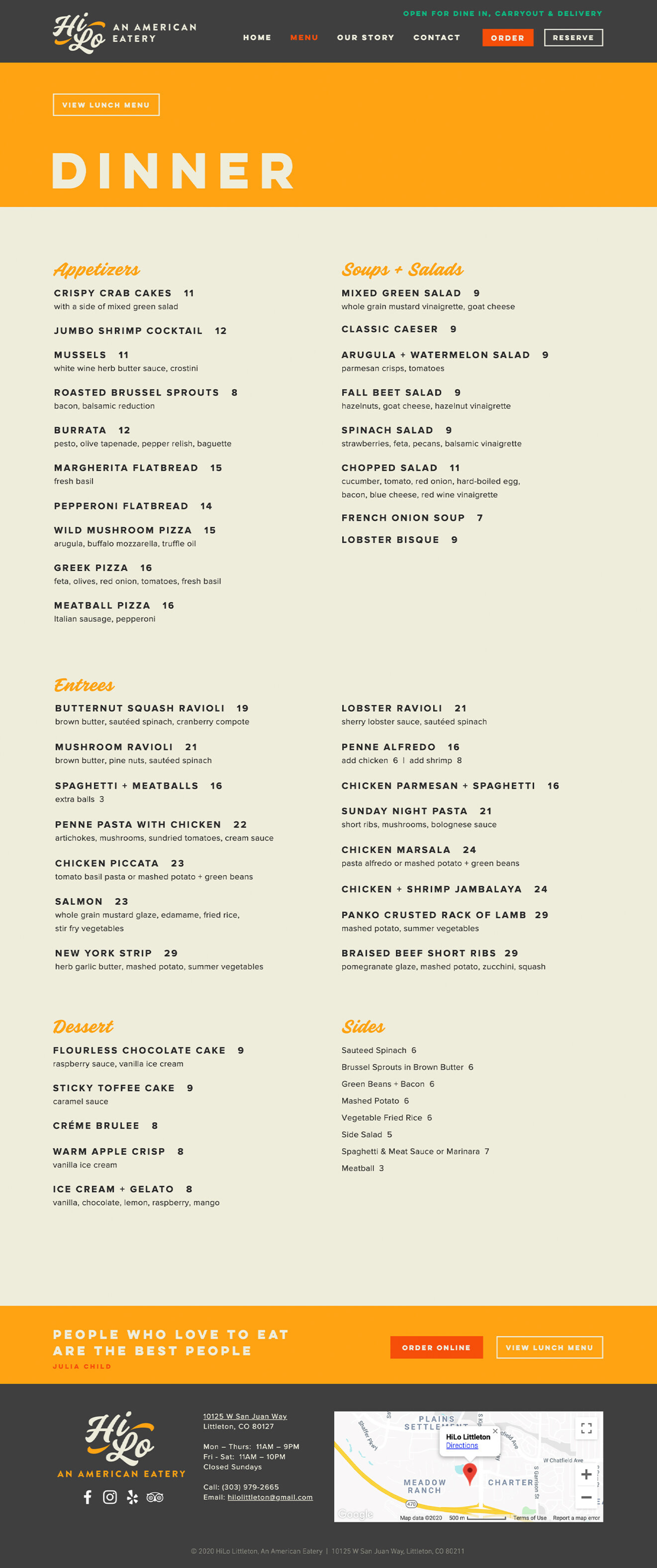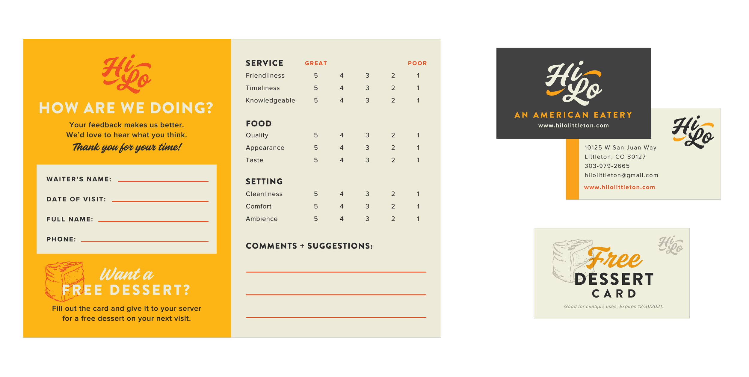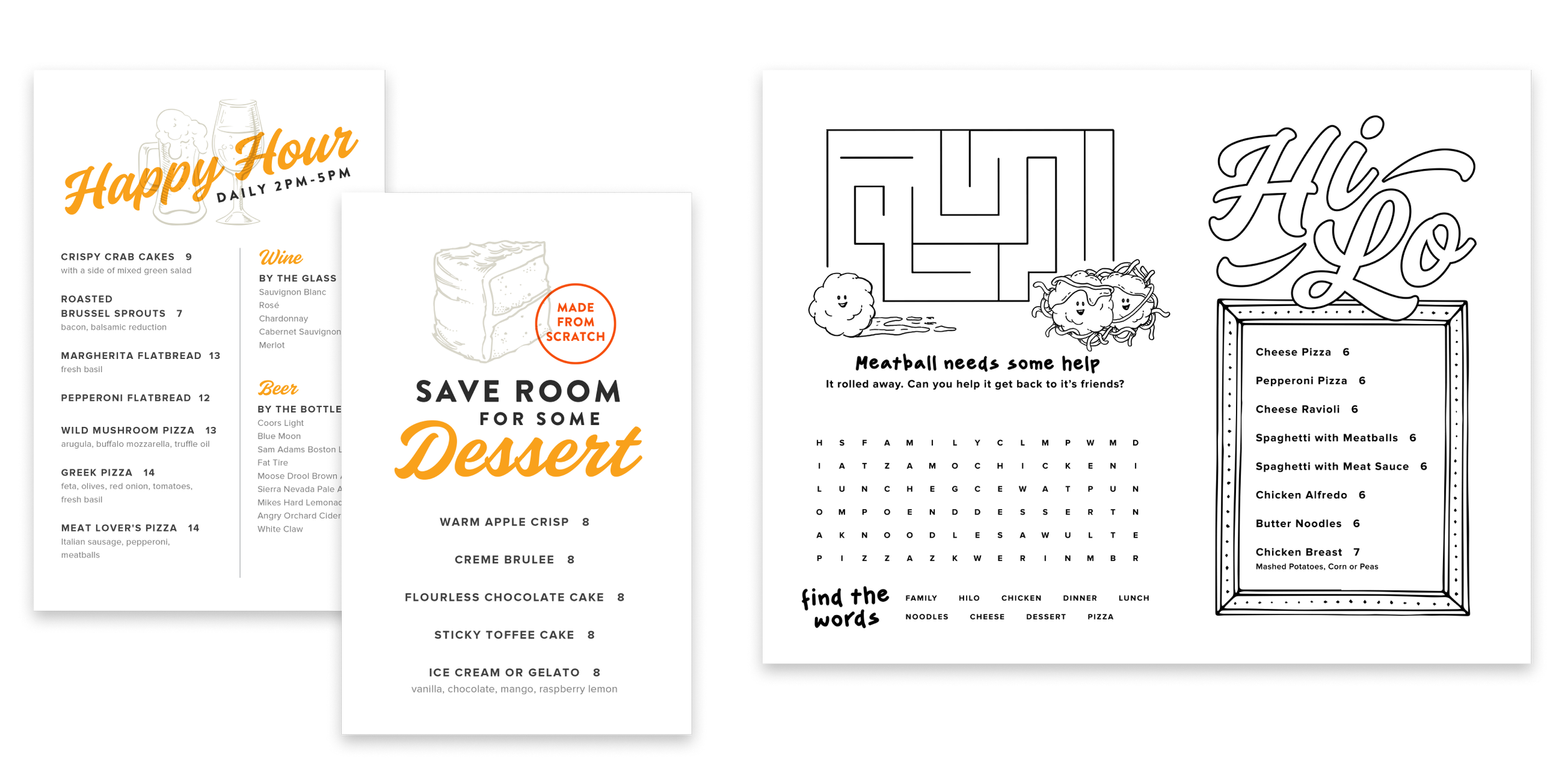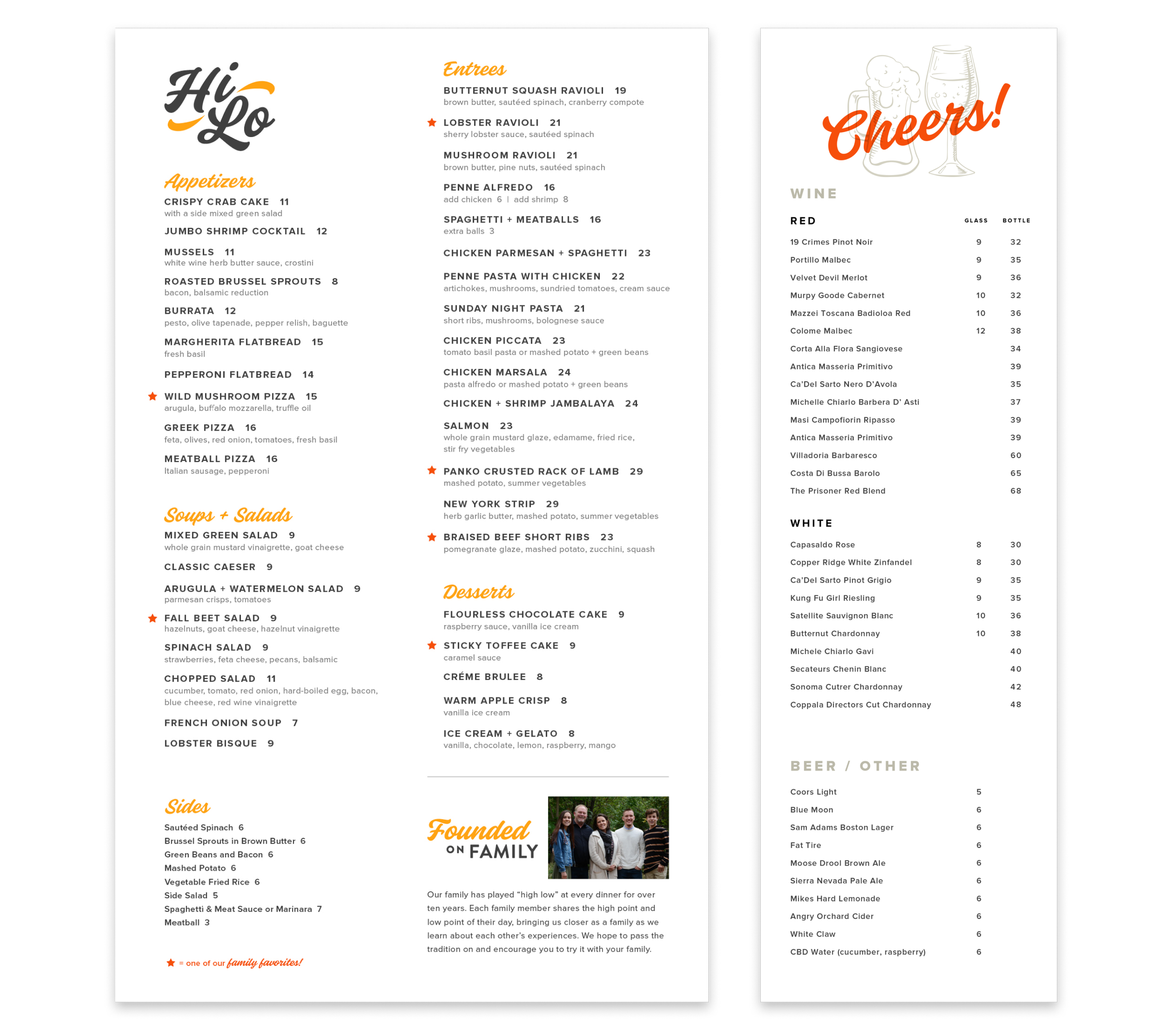 HiLo is an American eatery focused on family. For the logo, I wanted to create a sense of flow. I used warm colors to stimulate the appetite and invoke a family-friendly atmosphere. The website was designed and built within Wix. I also created 4 menus (lunch, dinner, drinks & kids), table tent with the happy hour & dessert specials, comment cards, van design for catering, and business cards.